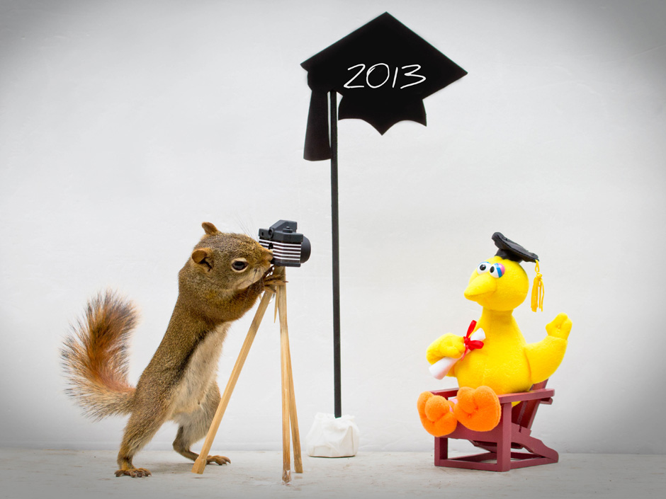 Guidance counselor snaps photos of wild squirrels interacting with miniature props